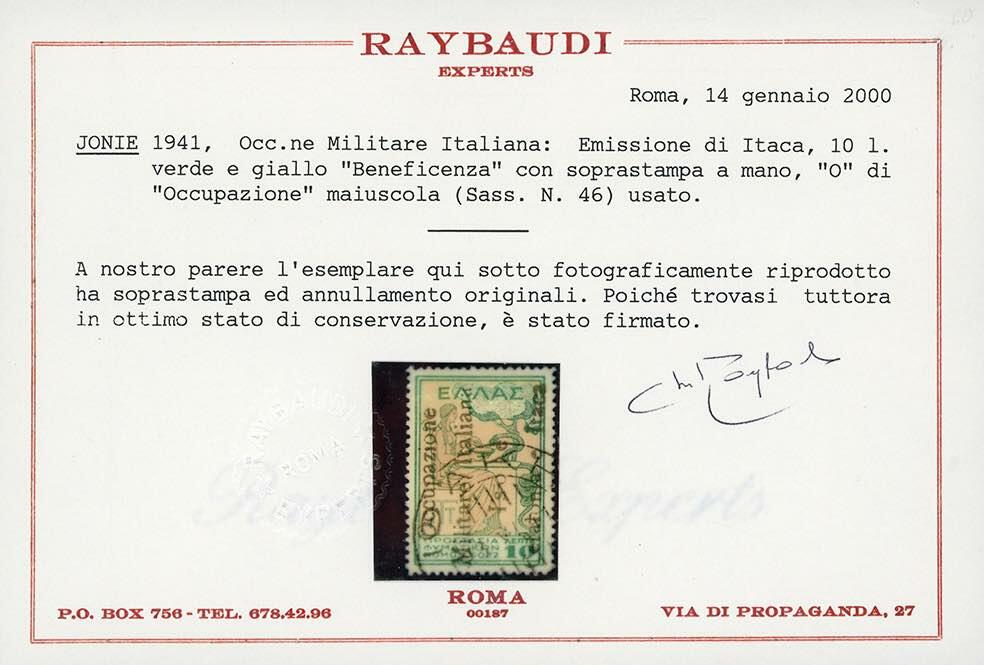 | Zusatzinformationen und Suchstichworte: | 26. Ferrario Auktion 1. Oktober 2022 Los 1612 Ionische Inseln Lokal Kefalonia und Ithaka EMISSIONI DI ITACA 1941 - 10 l. Beneficenza (46), usato, perfetto. Raro. Modolfo, A.Diena, Ferrario, cert. Raybaudi ed E.Diena. Cat. € 12000 Ausruf 1.000,00 EUR |