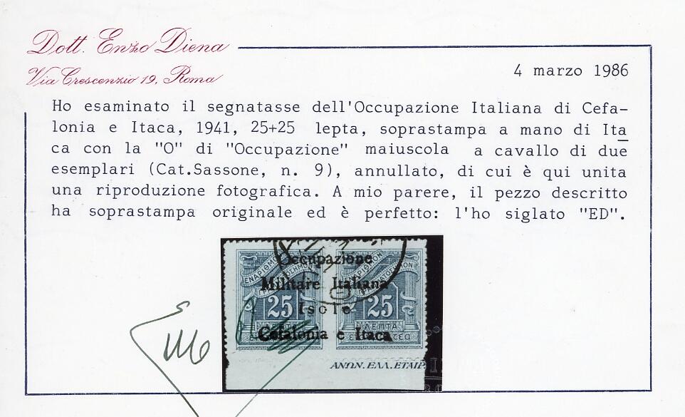 | Zusatzinformationen und Suchstichworte: | 26. Ferrario Auktion 1. Oktober 2022 Los 1617 Ionische Inseln Lokal Kefalonia und Ithaka EMISSIONI DI ITACA SEGNATASSE 1941 - 25 l. + 25 l. (9), bordo di foglio, usato, perfetto. Raro. Penco, A.Diena, cert. E.Diena e Ferrario. Cat. € 8500 Ausruf 700,00 EUR |