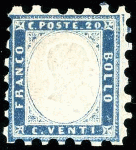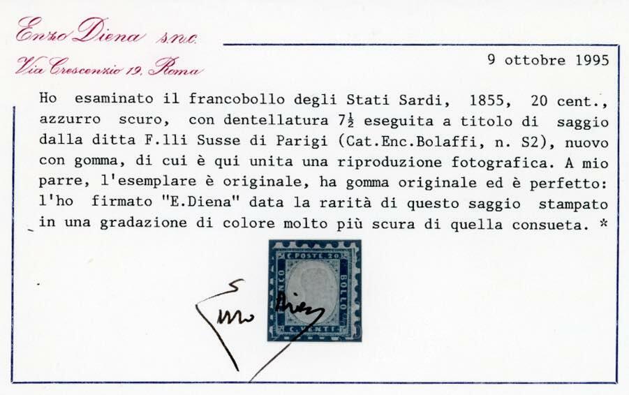 | Zusatzinformationen und Suchstichworte: | 26. Ferrario Auktion 1. Oktober 2022 Los 885 Italien Königreich - Vittorio Emanuele II 1862 - 20 cent. azzurro, prova di dentellatura 7 1/2 eseguita dalla tipografia Susse (2o), gradazione di colore molto più scura di quella consueta, gomma originale, perfetto. Si tratta dell'UNICO ESEMPLARE NOTO in questa tonalità di colore, rarissimo. A.Diena, cert. E.Diena Ausruf 2.500,00 EUR |