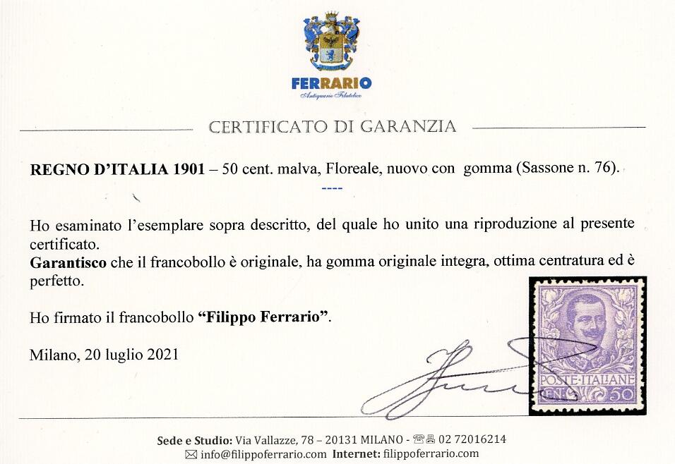 | Zusatzinformationen und Suchstichworte: | 26. Ferrario Auktion 1. Oktober 2022 Los 988 Italien Königreich - Vittorio Emanuele III 1901 - 50 cent. Floreale (76), ottima centratura, gomma originale integra, perfetto. Molto fresco. Cert. Ferrario e Diena. Cat. € 9500 Ausruf 1.000,00 EUR |