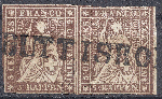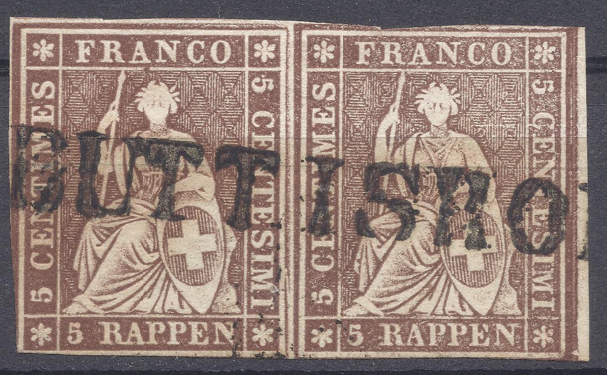 | Zusatzinformationen und Suchstichworte: | Attest stimmt nicht. Wird die Marke in Reinbenzin eingelegt, sieht man einen schwarzen Seidenfaden. Dazu kommt, dass die Druckform-Ordnung (DFO) nicht passt fuer eine 22Gb. Sieht man auch noch den Klischee-Fehler 1.15 auf der linken Marke, dann ergibt dies zusammen ein Paar 22B3.IV gemaess Handbuch Hermann. |