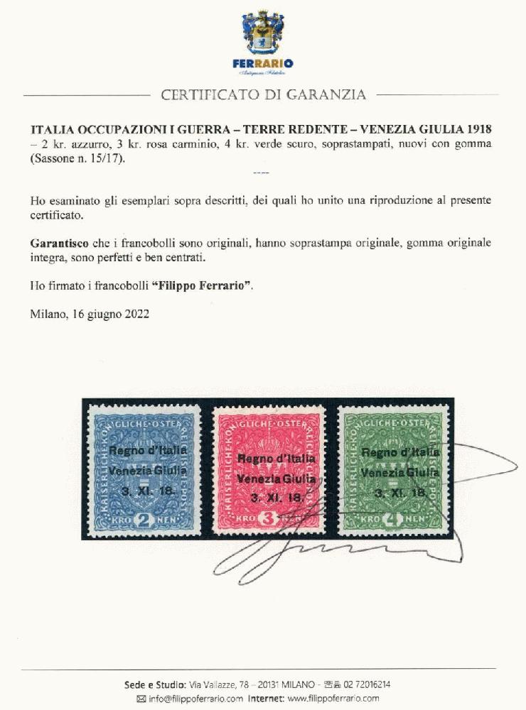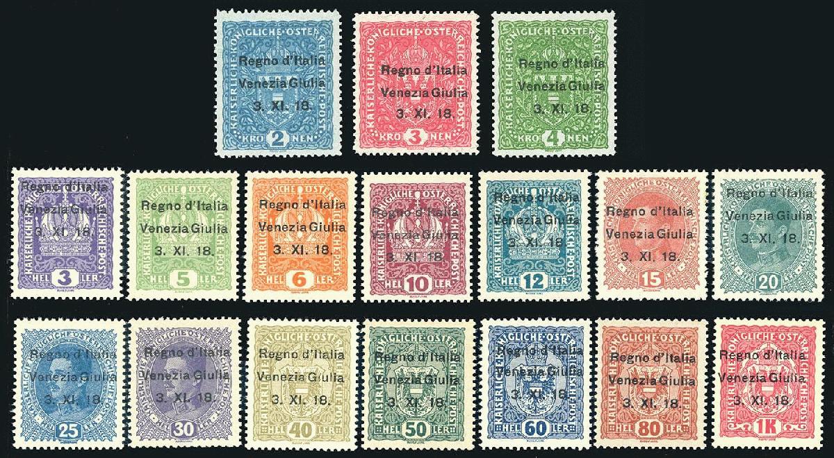 | Zusatzinformationen und Suchstichworte: | 26. Ferrario Auktion 1. Oktober 2022 Los 1551 Italien Besetzung I. WK Julisch Venetien VENEZIA GIULIA 1918 - Soprastampati, serie completa (1/17), gomma originale integra, perfetti. Belli e rari. Cert. Raybaudi per gli alti valori. Cat. € 8250 Ausruf 1.200,00 EUR |