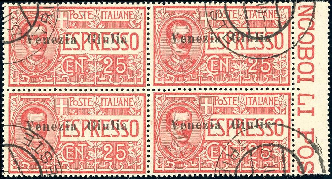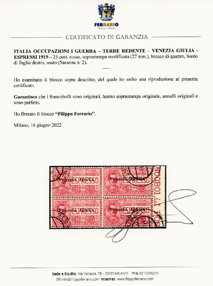 | Zusatzinformationen und Suchstichworte: | 26. Ferrario Auktion 1. Oktober 2022 Los 1553 Italien Besetzung I. WK Julisch Venetien VENEZIA GIULIA ESPRESSI 1919 - 25 cent., soprastampa di tipo diverso (2), blocco di quattro, bordo di foglio, usato, perfetto. Molto raro in blocco. Cert. Ferrario. Cat. € 10000 Ausruf 1.000,00 EUR |