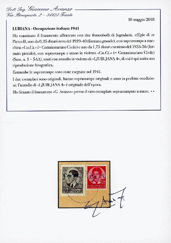 | Zusatzinformationen und Suchstichworte: | 26. Ferrario Auktion 1. Oktober 2022 Los 1575 Italien Besetzung II. WK Laibach LUBIANA 1941 - 1,75 d. soprastampato a mano "Co.Ci" in violetto, con complementare (5AA,1), perfetti, usato si piccolo frammento. Molto raro. Ferrario, cert. Avanzo. Cat. € 8500 Ausruf 1.000,00 EUR |