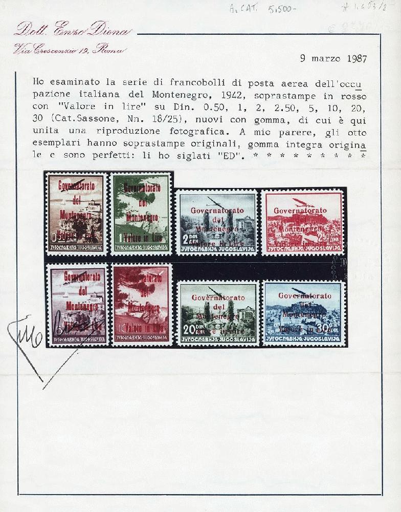 | Zusatzinformationen und Suchstichworte: | 26. Ferrario Auktion 1. Oktober 2022 Los 1649 Italien Besetzung II. WK Montenegro MONTENEGRO POSTA AEREA 1942 - Soprastampati in rosso, serie completa (18/25), gomma originale integra, perfetti, ad eccezione del 5 d. che presenta un piccolo difetto. Rara, tiratura 500 serie. Cert. E.Diena. Cat. € 7000 Ausruf 1.000,00 EUR |