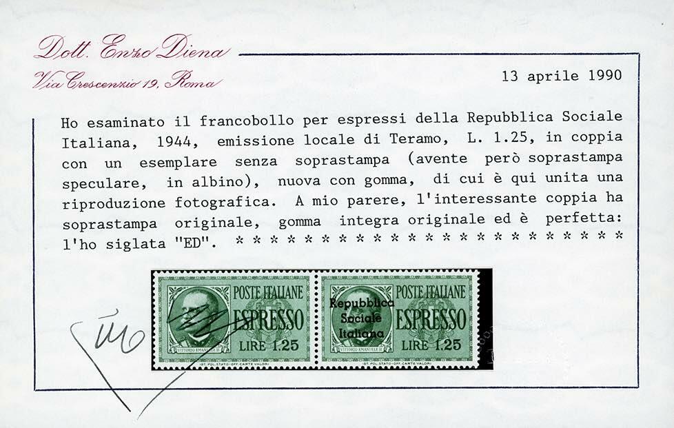 | Zusatzinformationen und Suchstichworte: | 26. Ferrario Auktion 1. Oktober 2022 Los 1497 Italien Lokalausgabe Teramo TERAMO ESPRESSI 1944 - 1,25 lire espresso, coppia orizzontale, un esemplare senza soprastampa (16c), gomma originale integra, perfetta. Molto rara. Cert. E.Diena e Ferrario. Cat. € 16500 Ausruf 1.000,00 EUR |