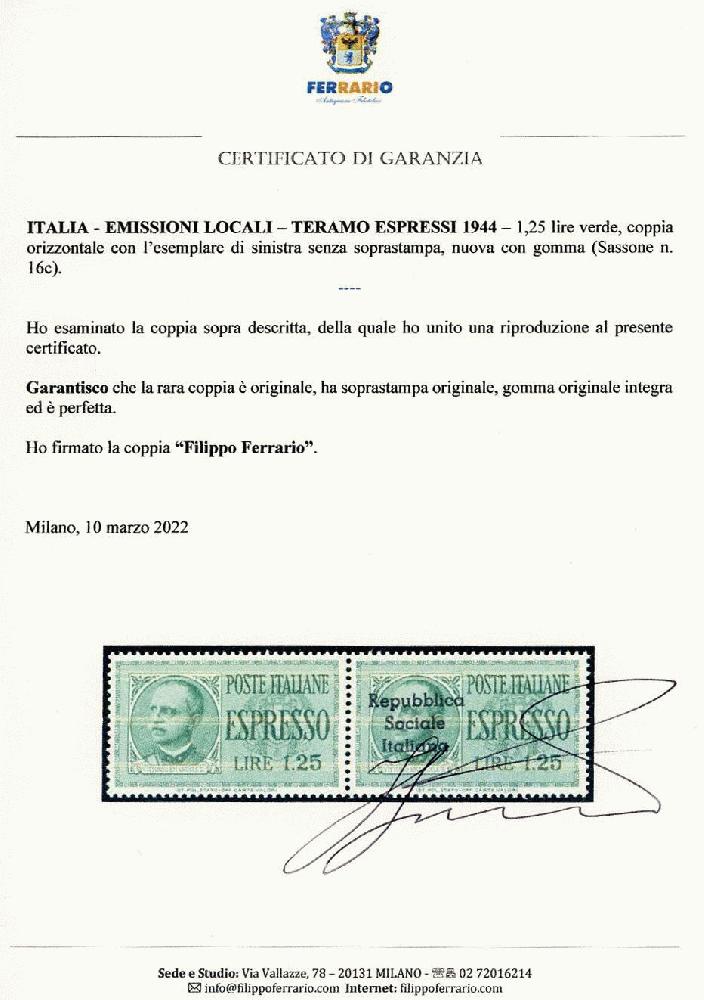 | Zusatzinformationen und Suchstichworte: | 26. Ferrario Auktion 1. Oktober 2022 Los 1497 Italien Lokalausgabe Teramo TERAMO ESPRESSI 1944 - 1,25 lire espresso, coppia orizzontale, un esemplare senza soprastampa (16c), gomma originale integra, perfetta. Molto rara. Cert. E.Diena e Ferrario. Cat. € 16500 Ausruf 1.000,00 EUR |