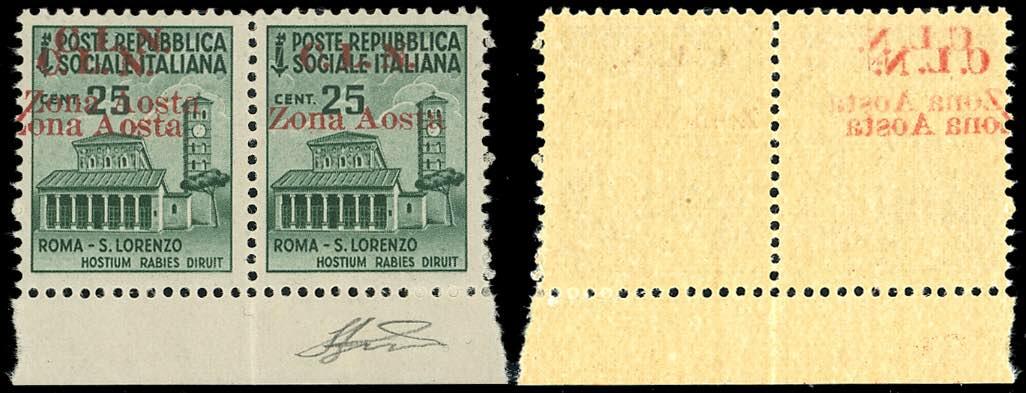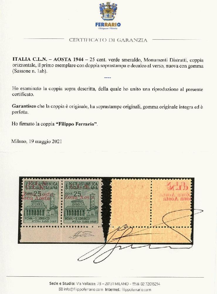 | Zusatzinformationen und Suchstichworte: | 26. Ferrario Auktion 1. Oktober 2022 Los 1500 Italien Lokalausgaben C.L.N. Aosta AOSTA 1944 - 25 cent., coppia orizzontale, il primo esemplare con doppia soprastampa (1ab), decalco al verso, gomma integra, perfetta. Cert. Ferrario. Cat. € 4500 Ausruf 250,00 EUR |