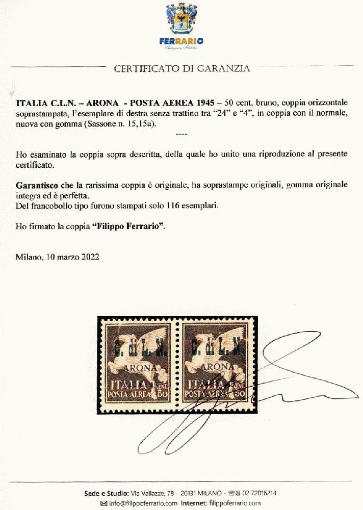 | Zusatzinformationen und Suchstichworte: | 26. Ferrario Auktion 1. Oktober 2022 Los 1509 Italien Lokalausgaben C.L.N. Arona ARONA POSTA AEREA 1945 - 50 cent., coppia, un esemplare senza trattino tra "24" e "4" /15,15a), gomma originale integra, perfetta. Molto rara, tiratura 116 esemplari del francobollo tipo. Cert. Ferrario. Cat. € 20000 Ausruf 1.000,00 EUR |