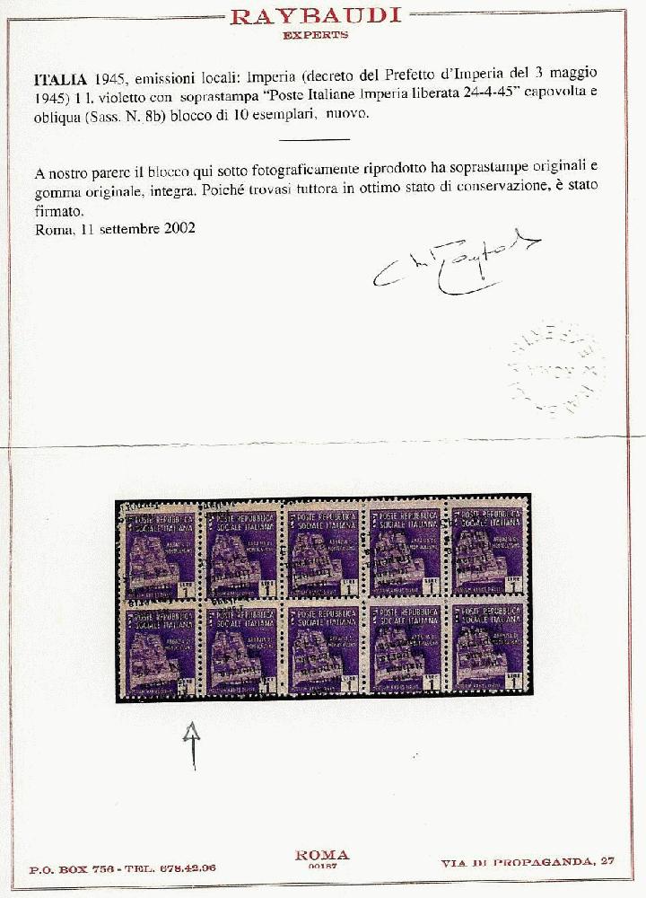 | Zusatzinformationen und Suchstichworte: | 26. Ferrario Auktion 1. Oktober 2022 Los 1514 Italien Lokalausgaben C.L.N. Imperia IMPERIA 1945 - 1 lira, soprastampa capovolta e obliqua (8b), blocco di quattro, gomma integra, perfetto. Ferrario, fotocopia cert. Raybaudi del blocco di provenienza. Cat. € 2400 Ausruf 150,00 EUR |