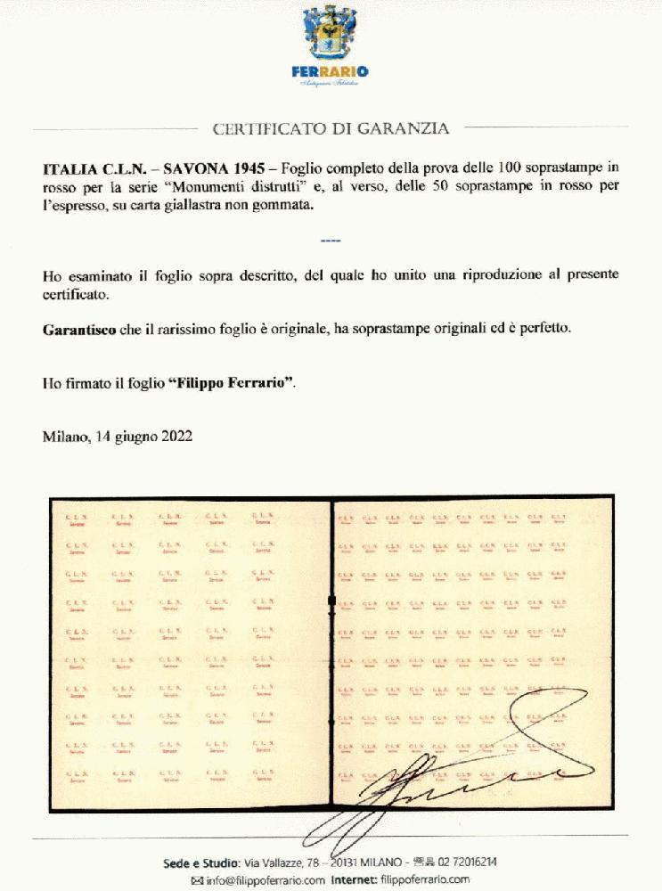 | Zusatzinformationen und Suchstichworte: | 26. Ferrario Auktion 1. Oktober 2022 Los 1524 Italien Lokalausgaben C.L.N. Savona SAVONA 1945 - Foglio completo della prova delle cento soprastampe in rosso per la serie Monumenti distrutti e, al verso, delle cinquanta soprastampe in rosso per l'espresso, su carta giallastra non gommata. Insieme rarissimo . Cert. Ferrario Ausruf 1.000,00 EUR |