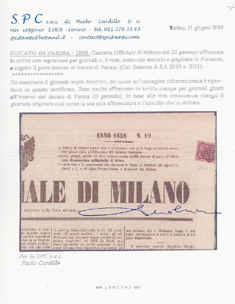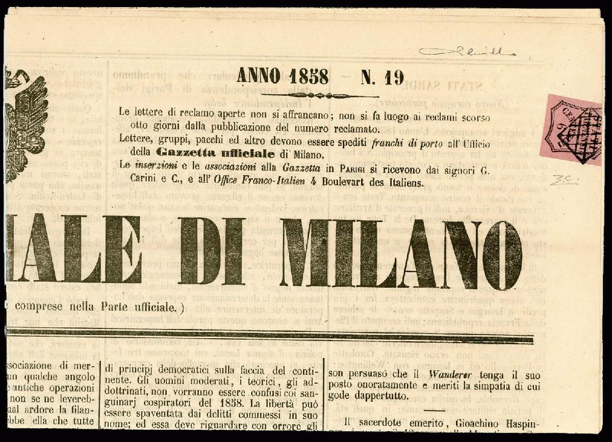 | Zusatzinformationen und Suchstichworte: | 26. Ferrario Auktion 1. Oktober 2022 Los 314 Italien Staaten Parma Zeitungsstempelm. SEGNATASSE PER GIORNALI 1858 - 6 cent. rosa vivo (1), corto in alto, annullato con bollo muto a griglietta su giornale "Gazzetta Ufficiale di Milano" del 22/1/1858. Raro. Colla, cert. Cardillo. Cat. € 30000 Ausruf 600,00 EUR |