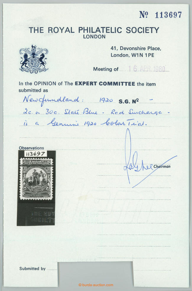 | Zusatzinformationen und Suchstichworte: | Burda 69. Auktion 10. - 11. September 2022 Los 598 Neufundland 1920 SG. 144var, Anstecker von Kolonie 30C mit Rotaufdruck zwei CENTS; siehe. Note. In SG. Unten Nummer 147; Pracht, Attest RPSL, c. v. £1,300; seltene Marke Zuschlag 1.600,00 EUR |