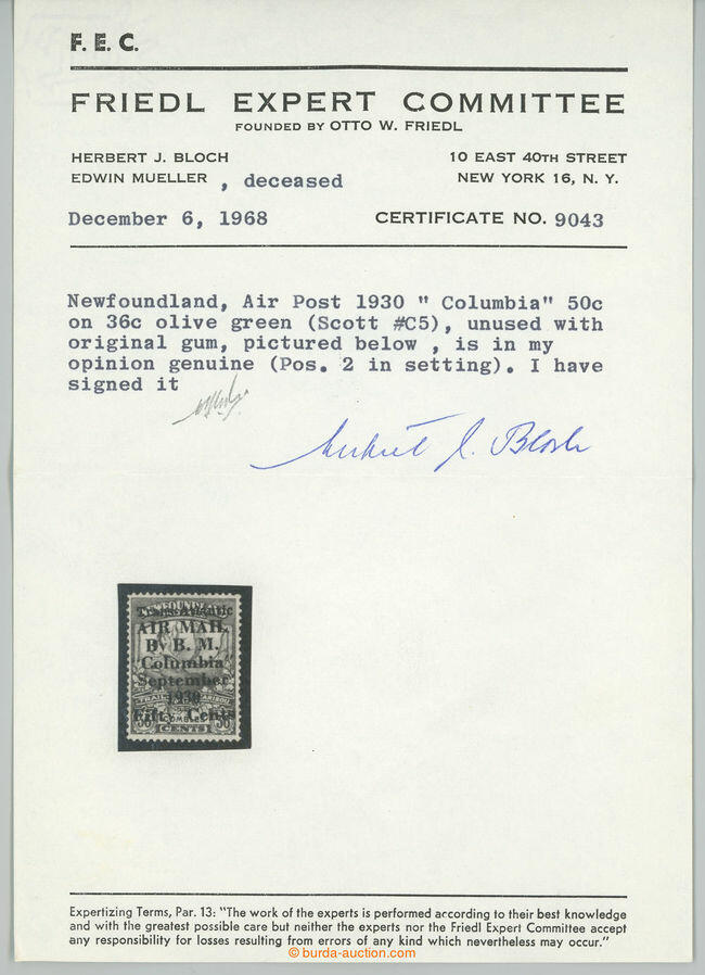 | Zusatzinformationen und Suchstichworte: | Burda 69. Auktion 10. - 11. September 2022 Los 603 Neufundland 1930 SG. 191, Caribou 36C grün mit Überdruck TRANS- Atlantischen Flugpost ... Fünfziger CENTS; Pracht, Attest FEC, Signatur H. Bloch; c. v. £6000, Scott. $9000, selten! Ausruf 7.200,00 EUR |