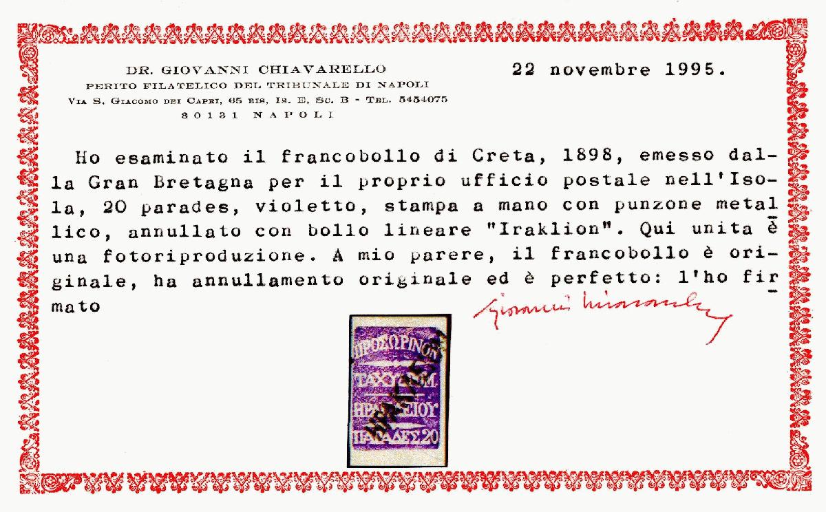 | Zusatzinformationen und Suchstichworte: | Georg Bühler 335. Auktion 17. September 2022 Los 949 Kreta Britische Verwaltung Provinz Herakleion Pracht, Fotobefund Chiavarello (Katalogwert: 280 Euro) Preis wurde vom Auktionshaus nicht zur Verfügung gestellt! |