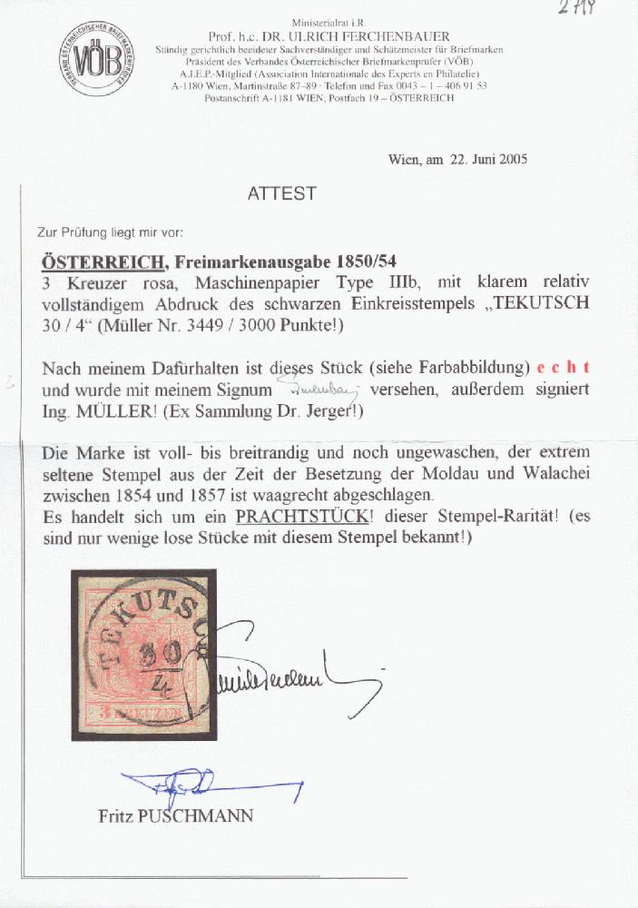 | Zusatzinformationen und Suchstichworte: | 13. classicphil GmbH Auktion 13. - 14. Oktober 2022 Los 2719 Krim Krieg Austrian fieldpost, occupation of Moldavia and Wallachia, 3 kr, red, TEKUTSCH, Müller 3449a/3000 p, sign Müller, cert Ferchenbauer, ex Demuth/Rothschild/Jerger, XF! Schätzpreis 6000.00€ Zuschlag 3.200,00 EUR |
