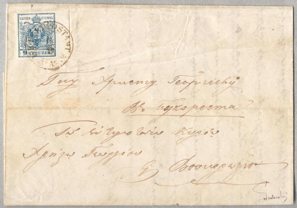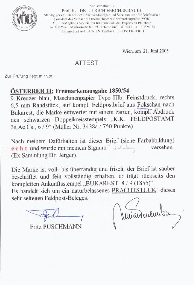 | Zusatzinformationen und Suchstichworte: | 13. classicphil GmbH Auktion 13. - 14. Oktober 2022 Los 2722 Krim Krieg 1854-56, Austrian fieldpost, occupation of Moldavia and Wallachia/Romania, 9 kr, blue, right margin copy, K.K. FELDPOSTAMT 3s. Ae.Cs./6/9 (Fokschan), Müller 3438a/750 p, on folded letter, ex Demuth/Jerger, cert Ferchenbauer/Puschmann, XF! Schätzpreis 10.000€. Zuschlag 6.000,00 EUR |