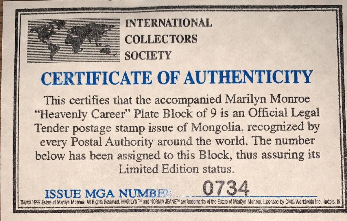 | Zusatzinformationen und Suchstichworte: | ebay.de Marilyn Monroe-InternationalCollectors Society- Mongolei W/ CERTIFICATE-PLASTIC Preis 25,99 USD |