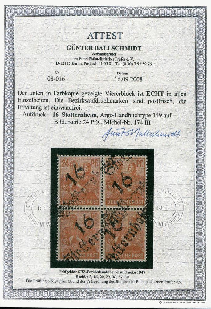 | Zusatzinformationen und Suchstichworte: | Schlegel Online-Shop Los 4201400598 SBZ Handstempel Bezirk 16 1948, 24 Pfg. Arbeiter Bezirksstempelaufdruckmarke Bezirk 16 Stotternheim, Type 149, postfrisches Exemplar in einwandfreier Qualität, im Handbuch mit Gruppe 10 bewertet, ein seltener Aufdruck! Farbkopie vom Fotoattest Ballschmidt BPP des ehemaligen Viererblockes beiliegend Festpreis 100,00 EUR |