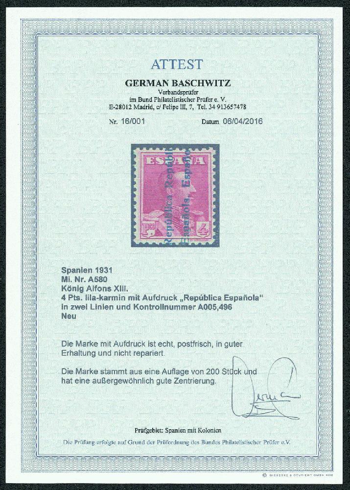 | Zusatzinformationen und Suchstichworte: | Gert Müller 115. Auktion 25. - 27. August 2022 Los 3142 Spanien 4 Pta. lilakarmin, König Alfons XIII., wundervoll farbfrisch, erstklassig gezähnt und tadellos postfr., ohne jegliche Signaturen. Ein traumhaft schönes Luxusstück dieser großen Spanien-Seltenheit, von welcher nur wenige postfr. Exemplare erhalten geblieben sind. Auflage nur 200 Stück! Fotoatteste CEM, Baschwitz BPP Zuschlag 3.600,00 EUR |