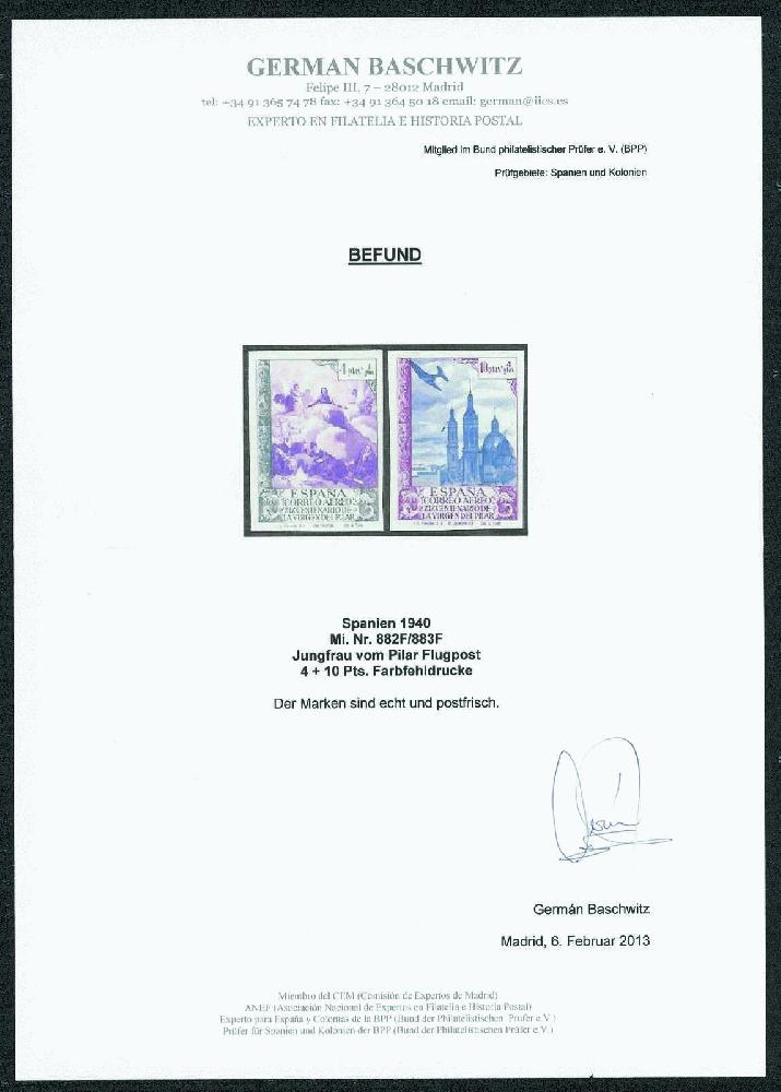 | Zusatzinformationen und Suchstichworte: | Gert Müller 115. Auktion 25. - 27. August 2022 Los 3171 Spanien Jungfrau vom Pilar 1940, die beiden Farbfehldrucke ungezähnt, tadellos postfr. Auflage nur 1000 Stück! Fotobefund Baschwitz Zuschlag 190,00 EUR |