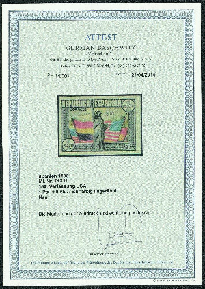 | Zusatzinformationen und Suchstichworte: | Gert Müller 115. Auktion 25. - 27. August 2022 Los 3158 Spanien 1 Pta. 150. Jahrestag der nordamerikanischen Verfassung 1938 ungezähnt, tadellos postfr. Fotoattest Baschwitz BPP Zuschlag 420,00 EUR |