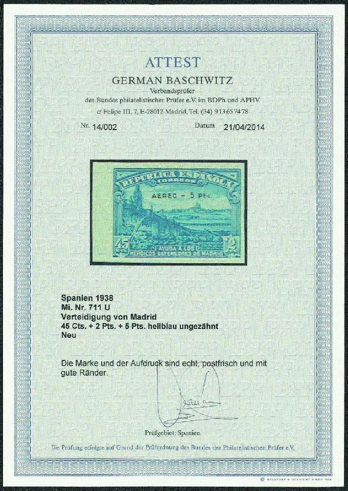 | Zusatzinformationen und Suchstichworte: | Gert Müller 115. Auktion 25. - 27. August 2022 Los 3153 Spanien 45 C. Verteidigung von Madrid 1938 vierseitig ungezähnt vom linken Rand, farbfrisch und tadellos postfr., sehr geringe Auflage, Fotoattest Baschwitz BPP Ausruf 400,00 EUR |