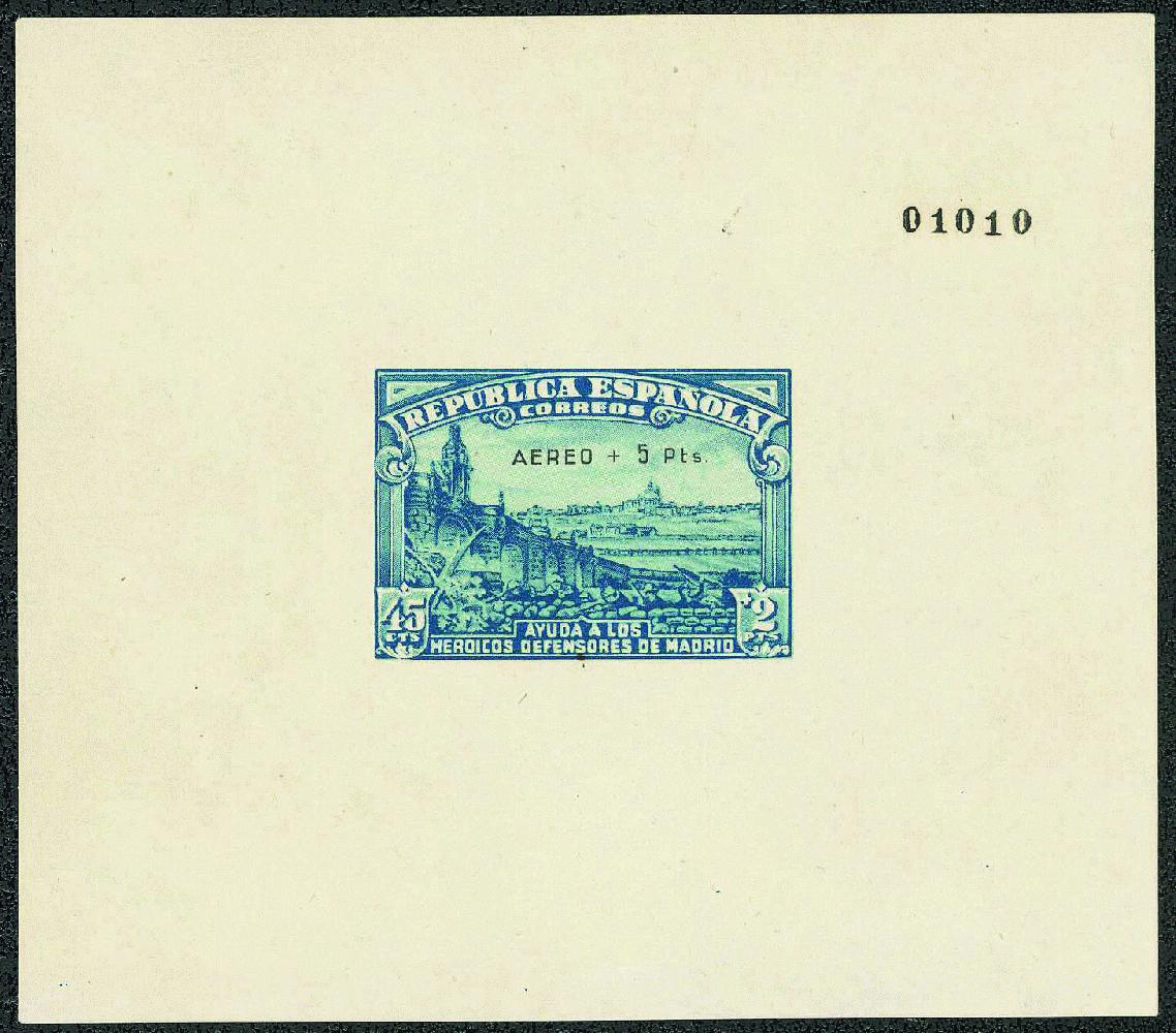| Zusatzinformationen und Suchstichworte: | Gert Müller 115. Auktion 25. - 27. August 2022 Los 3155 Spanien DER UNGEZÄHNTE MADRID-BLOCK: Flugpost-Block 1938 für die Verteidigung von Madrid UNGEZÄHNT, wundervoll farbfrisch und in voller Originalgröße, tadellos postfr. Eine der großen Spanien-Seltenheiten in absolut perfekter Erhaltung. Es sind nur wenige einwandfreie postfr. Exemplare erhalten geblieben. Fotoattest Graus und weiteres Fotoattest Baschwitz BPP Ausruf 6.000,00 EUR |
