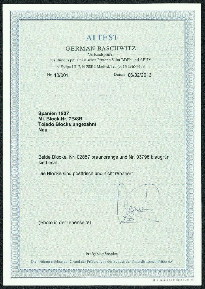 | Zusatzinformationen und Suchstichworte: | Gert Müller 115. Auktion 25. - 27. August 2022 Los 3164 Spanien Toledo-Blockpaar 1937 geschnitten, farbfrisch und tadellos postfr., ohne jegliche Signaturen. Luxus! Fotoattest Baschwitz BPP Zuschlag 800,00 EUR |