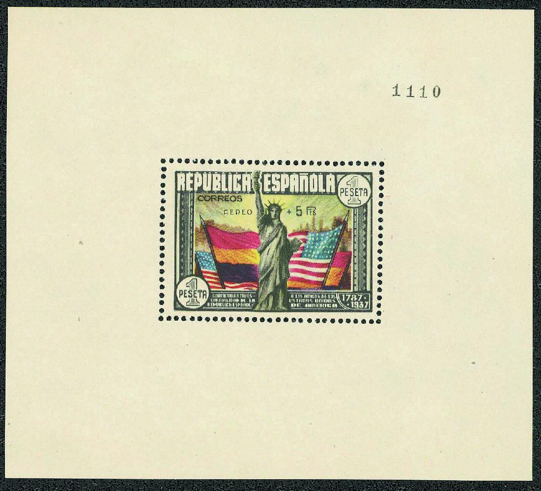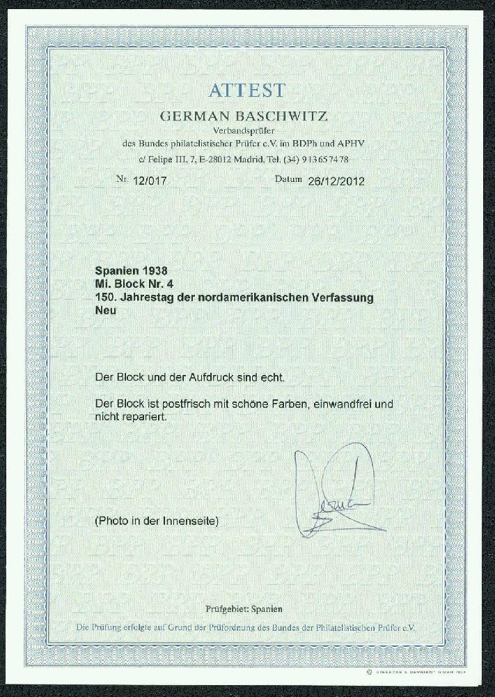 | Zusatzinformationen und Suchstichworte: | Gert Müller 115. Auktion 25. - 27. August 2022 Los 3159 Spanien 150. Jahrestag der nordamerikanischen Verfassung-Block 1938 gezähnt, farbfrisch und in voller Originalgröße, tadellos postfr. Luxus! Auflage nur 2660 Stück. Fotoattest Baschwitz Ausruf 1.200,00 EUR |
