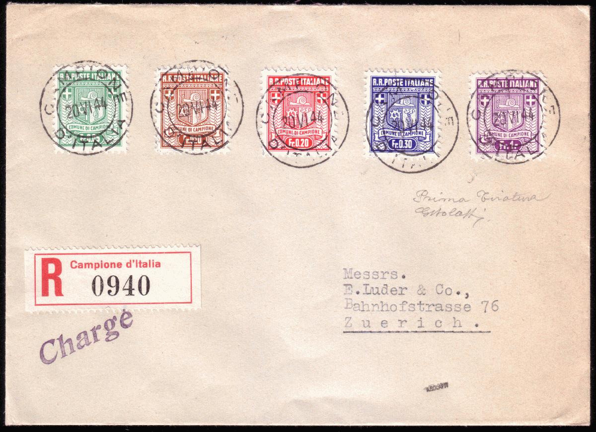 | Zusatzinformationen und Suchstichworte: | Il Ponte 573. Auktion, Briefmarken 19. September 2022 Los 77 Campione CAMPIONE D'ITALIA 1944 (20 giu.) Busta raccomandata da Campione d'Italia per Zurigo, affrancata con serie completa di 5 valori "Stemma", I tiratura, D.11½ Ausruf 380,00 EUR |