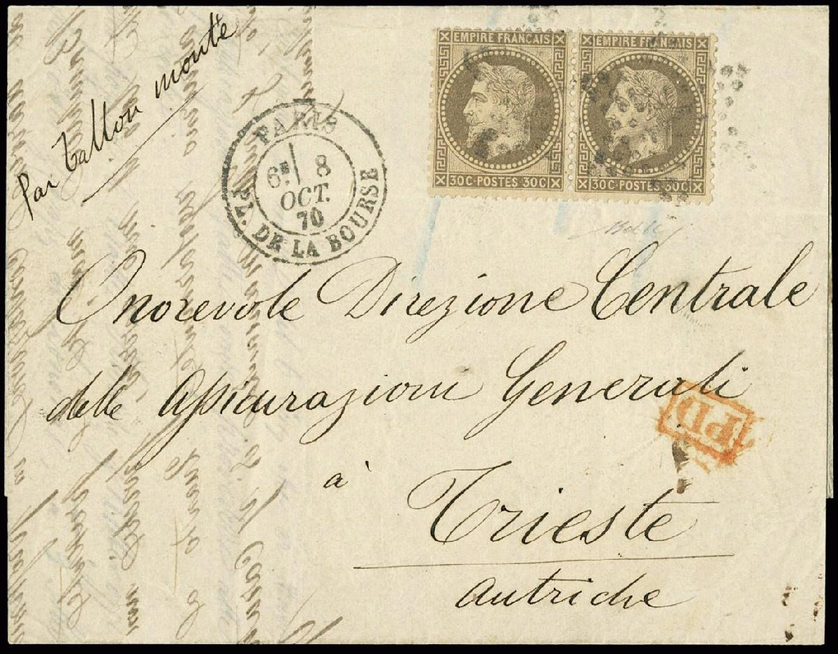 | Zusatzinformationen und Suchstichworte: | Zanaria Filatelici Sonderpreisliste Los 2254 Frankreich Krieg 1870-71 BALLON MONTE - 10: LE WASHINGTON or LE LOUIS BLANC to Triest 1870 - Brown 30c, "Napoleon Lauré" , pair canceled star from "PARIS PL DE LA BOURSE 8 OCT 70" to Triest, Austria. On the front blue austrian markings and on the back arrival postmark "TRIEST 20/10" and interesting blue advertising handstamp to seal the letter, carried by Le Washington or Le Louis Blanc. Extremely fine, rare, Bolaffi 100% certificate (Yvert 30 - Euro 4.350+) Festpreis 1.850,00 EUR |