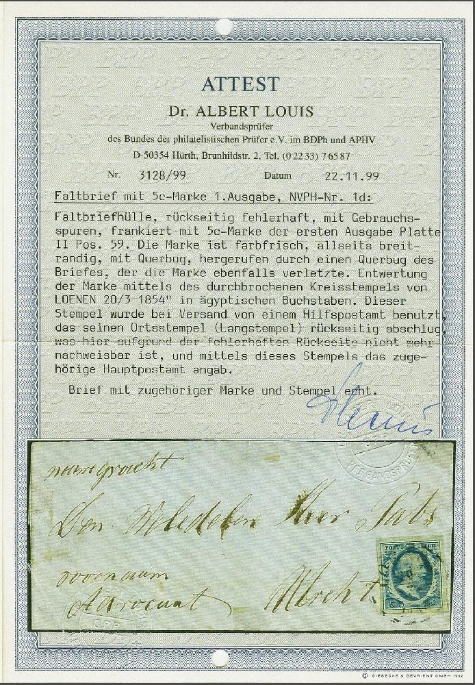 | Zusatzinformationen und Suchstichworte: | Corinphila Veilingen 255. Auktion 15. - 17. September 2022 Los 2286 Niederlande Gebroken cirkelstempel Loenen (Ey 250) op 5 cent blauw op briefomslag 20-3-1854 naar Utrecht, vrijwel pracht ex. (zegel vouwtje) met certificaten Dr. Louis 1999 en NVPH 2000 Ausruf 100,00 EUR |