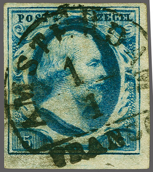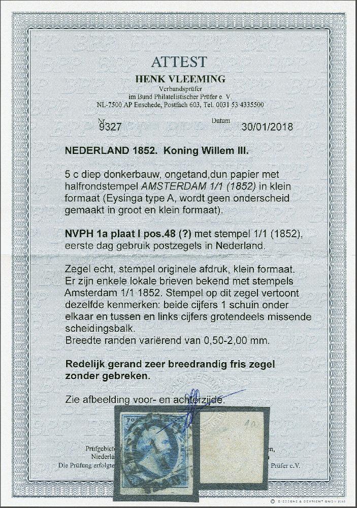 | Zusatzinformationen und Suchstichworte: | Corinphila Veilingen 255. Auktion 15. - 17. September 2022 Los 2067 Niederlande 5 cent diep donkerblauw plaat I pos. 48 met eerste dagstempel Amsterdam 1-1-(1852), pracht ex. met certificaat Vleeming 2018 Ausruf 400,00 EUR |