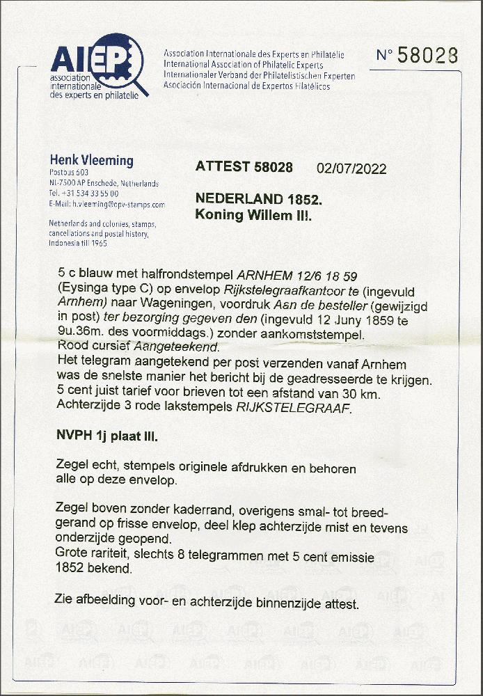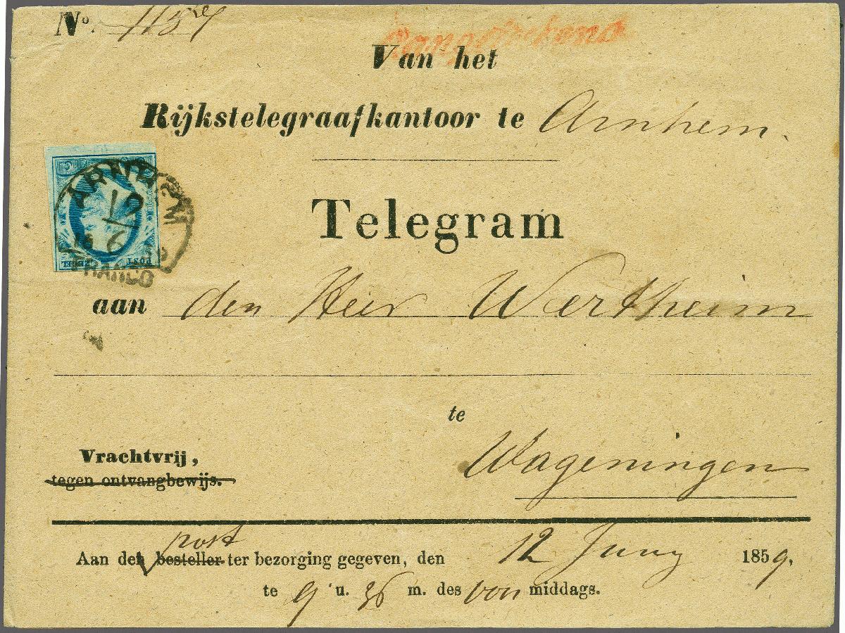 | Zusatzinformationen und Suchstichworte: | Corinphila Veilingen 255. Auktion 15. - 17. September 2022 Los 2011 Niederlande 5 cent blauw plaat III met ARNHEM 12/6 18 59, type C, op envelop Rijkstelegraaf naar Wageningen met rood cursief Aangeteekend, 5 cent tarief voor afstanden tot 30 km. Zegel boven aangesneden, overigens smal- tot breedrandig op frisse envelop, achterzijde mist deel klep en tevens onder geopend, ca.8 telegrammen met 5 cent bekend. Ausruf 1.000,00 EUR |