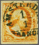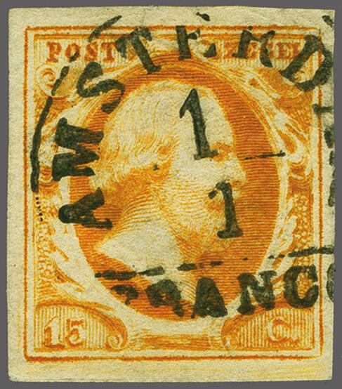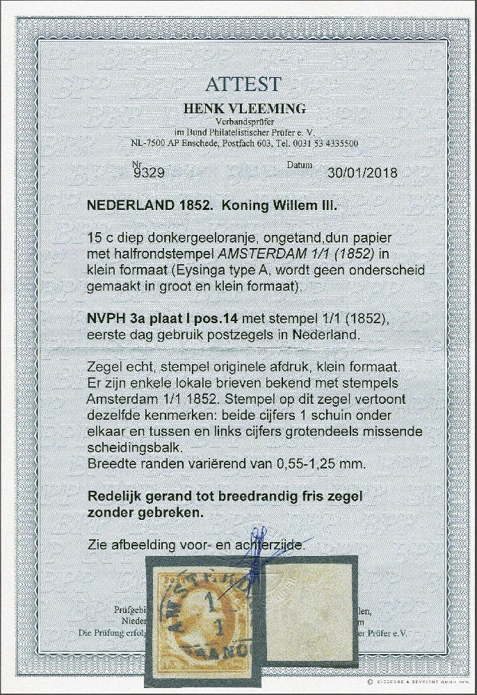 | Zusatzinformationen und Suchstichworte: | Corinphila Veilingen 255. Auktion 15. - 17. September 2022 Los 2069 Niederlande 5 cent donkergeeloranje pos. 14 met eerste dagstempel Amsterdam 1-1-(1852), pracht ex. met certificaat Vleeming 2018. Zeldzaam, het Corinphila-archief meldt 6 exemplaren van de 15 cent die aantoonbaar op 1-1-1852 zijn afgestempeld. Herkomst: collectie De Veer (1971) Ausruf 750,00 EUR |