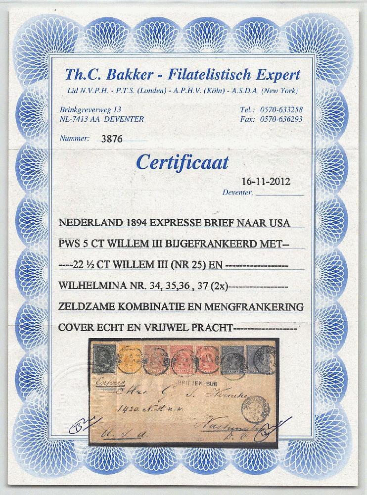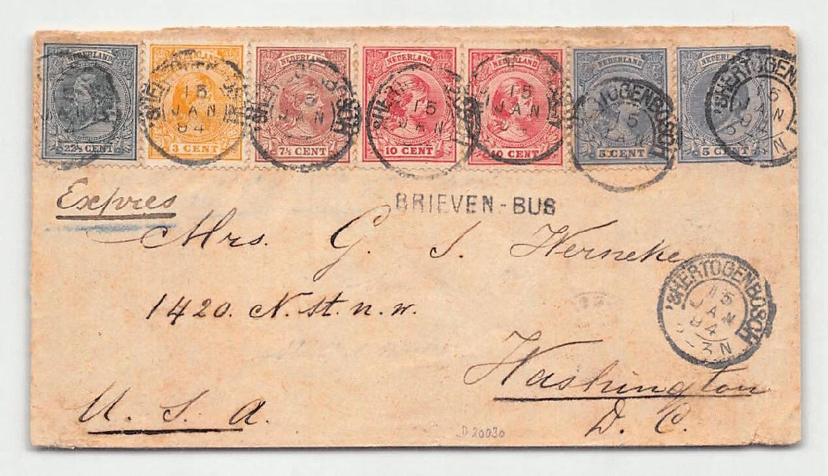 | Zusatzinformationen und Suchstichworte: | Alexander Voigt Los 0000102627 Niederlande 1891 Prinzessin Wilhelmina HERTOGENBOSCH - WASHINGTON (USA), EXPRESSBRIEF: 5 und 22 1/2 C. "Wilhelm III.", 3 bis 10 C. "Wilhelmina" als AUSSERGEWÖHNLICHE BUNTFRANKATUR mit K2 "HERTOGENBOSCH, II, 5 JAN 94, 2-3 N", Aus-dem-Briefkasten-L1 "BRIEVEN-BUS" auf Auslands-Expressbrief nach Washington, USA. Rückseitig US-amerikanische Stempel: L2 "LATE MAIL", Duplex "NEW YORK, JAN 27 / PAID ALL / D 94" und Anunfts-K1 "WASHINGTON D.C., REG'D, JAN 28 1894, 5- AM". Senkrechte Faltung zwischen der 22 1/2 - und 3 C - Marken. Fotoattest Th. C. Baker: "ZELDZAME KOMBINATIE EN MENGFRANKERING COVER ECHT EN VRIJWEL PRACHT". Unsigniert. Festpreis 350,00 EUR |