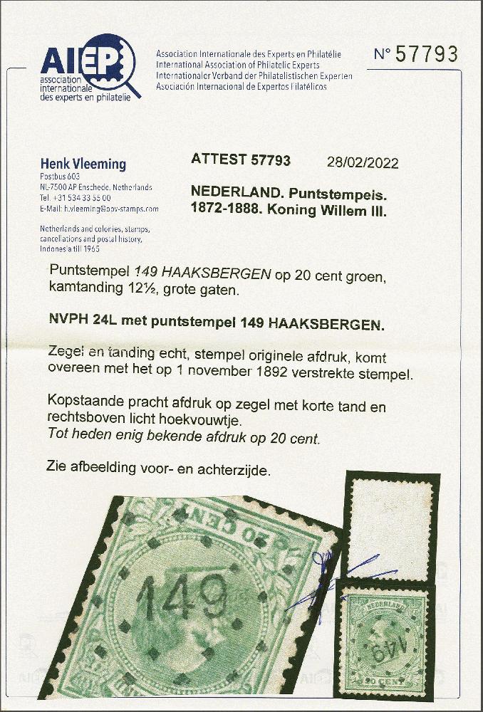 | Zusatzinformationen und Suchstichworte: | Corinphila Veilingen 255. Auktion 15. - 17. September 2022 Los 2532 Niederlande 149 - HAAKSBERGEN - op Willem III 20 cent, pracht afdruk, zegel kort tandje en licht hoekvouwtje, enig bekende afdruk op 20 cent Ausruf 500,00 EUR |