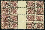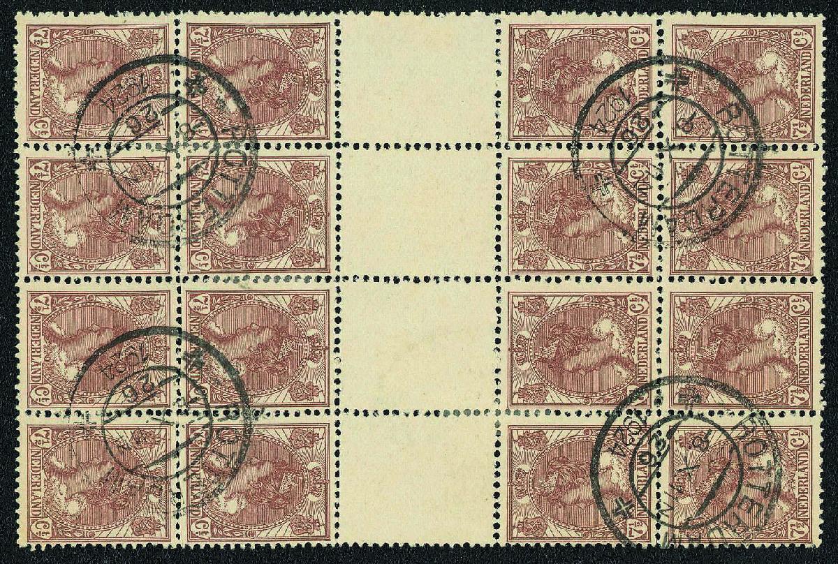 | Zusatzinformationen und Suchstichworte: | Gert Müller 115. Auktion 25. - 27. August 2022 Los 2883 Niederlande 7 1/2 C. Königin Wilhelmina 1899, spektakuläre Einheit von 16 Werten mit vier Kehrdruck-Zwischenstegen, sauber gest. "ROTTERDAM 8.X.26.", farbfrisch und gut gezähnt, Zähnung stellenweise leicht vorgefaltet und mit Falz gestützt. Eine sensationelle Einheit dieses enorm seltenen Kehrdruck-Zwischensteges für die anspruchsvolle Spezialsammlung! Fotoattest Flemming/AIEP Ausruf 2.000,00 EUR |