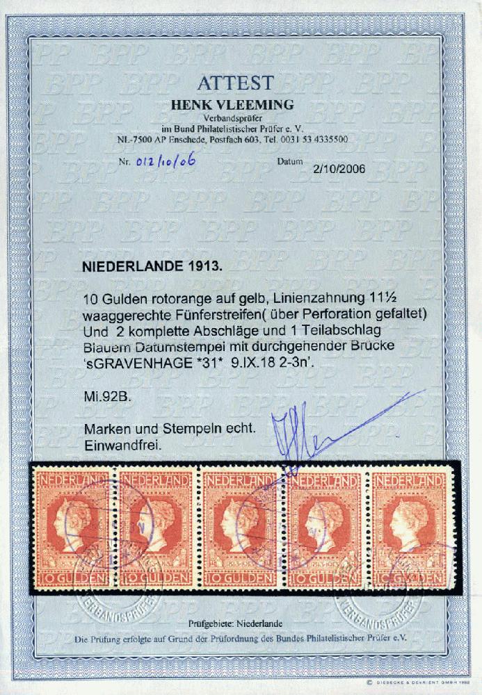 | Zusatzinformationen und Suchstichworte: | 75. AAK Phila GmbH Auktion 9. September 2022 Los 425 D Niederlande 10 G Wilhelmina im waagr. 5er-Streifen (gefaltet), 3x rundgest. Luxus m. einwandfreien Attesten BPSB u. Vleeming BPP! Imposante Einheit f.d. große Slg.! Zuschlag 900,00 EUR |