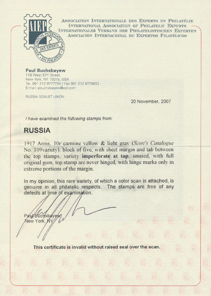 | Zusatzinformationen und Suchstichworte: | Christoph Gärtner 54. Auktion 18. - 19. Oktober 2022 Los 4277 D Russland 1917, Wappen 10 r. Oberrandbogenteil von fünf mit Tab zwischen, ungezähnt oben, postfrisch, frisch und fein. Eine äußerst seltene (wenn nicht einmalig) Einheit dieser Abart. Buchsbayew Attest. (Sc. 109 Abart). Ausruf 3.200,00 EUR |