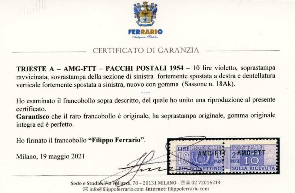 | Zusatzinformationen und Suchstichworte: | 26. Ferrario Auktion 1. Oktober 2022 Los 1487 Triest Zone A PACCHI POSTALI 1949 - 10 lire soprastampa ravvicinata, soprastampa della sezione sinistra fortemente spostata a destra e dentellatura verticale fortemente spostata a sinistra (18AK), gomma integra, perfetto. Raro. R.Mondolfo, cert. Ferrario. Cat. € 4800 Ausruf 500,00 EUR |