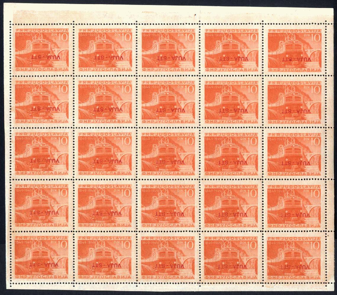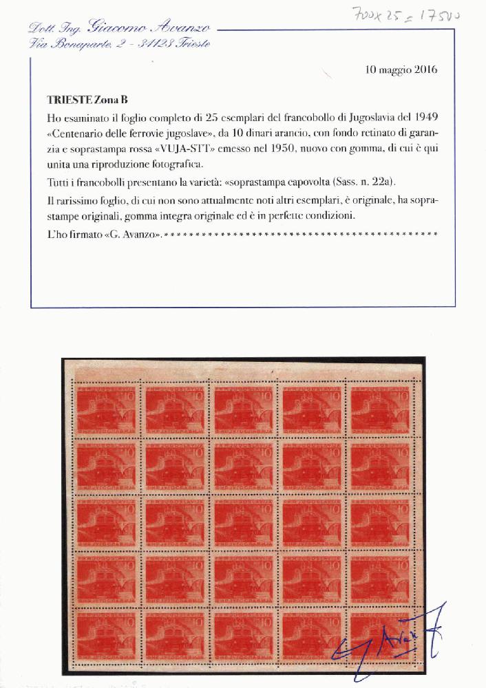 | Zusatzinformationen und Suchstichworte: | 75. Viennafil Live-Auktion 29. November - 2. Dezember 2022 Los 705 Triest Zone B 1950, Centenario delle ferrovie, 10 Dinari con soprastampa rovesciata nuovi con gomma integra, foglietto completo di 25 esemplari, cert. Avanzo, unico, Sass. 22a Ausruf 2.000,00 EUR |