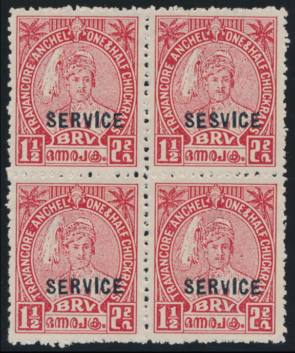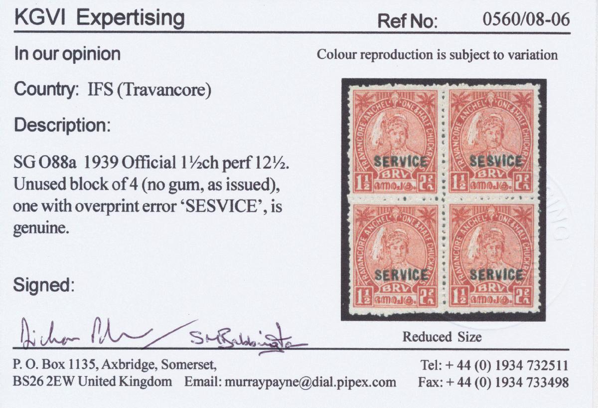 | Zusatzinformationen und Suchstichworte: | Doreen Royan & Associates Shop - Online Los 751218 (D) Indien Staaten Travancore India/Travancore 1939 King George VI Official. 1 1/2ch. scarlet. Block of four. Perf. 12 1/2. Variety, ‘”SESVICE” for “SERVICE” (top right stamp)’. Without gum, as issued. KGVI Expertising Certificate No. 0560/08-06 (2006). SCARCE Festpreis 300,00 GBP |