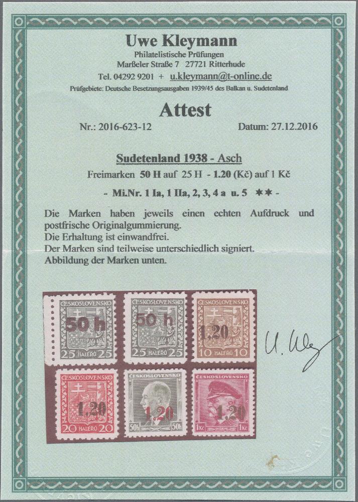 | Zusatzinformationen und Suchstichworte: | Christoph Gärtner 54. Auktion 18. - 19. Oktober 2022 Los 5547 D Sudetenland Asch 1938, Satz mit beiden Aufdruck-Typen 50 h dünner und dicker Aufdruck, 6 Werte postfrisch, teilweise unterschiedlich signiert, "echt und einwandfrei", Fotoattest Kleymann Ausruf 400,00 EUR |