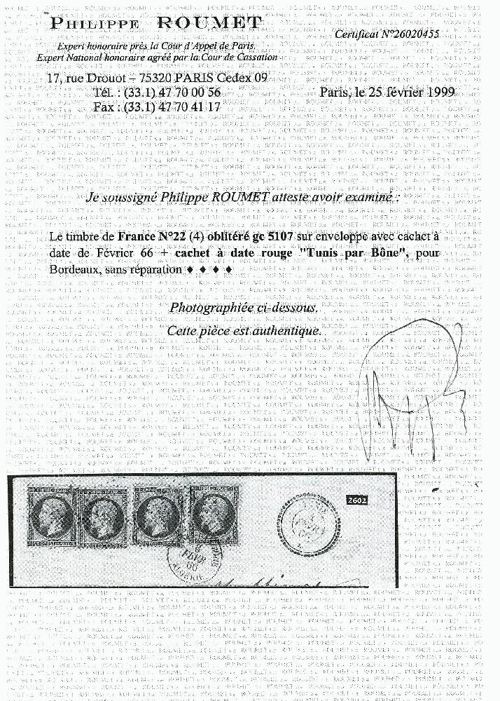 | Zusatzinformationen und Suchstichworte: | Lugdunum 122. Auktion 3. Oktober 2022 Los 1113 Tunesien 1866 20c (n°22)x4 obl. GC 5017 + TUNIS sur lettre pour la FRANCE. Rare. Certificat ROUMET. TTB Ausruf 150,00 EUR |