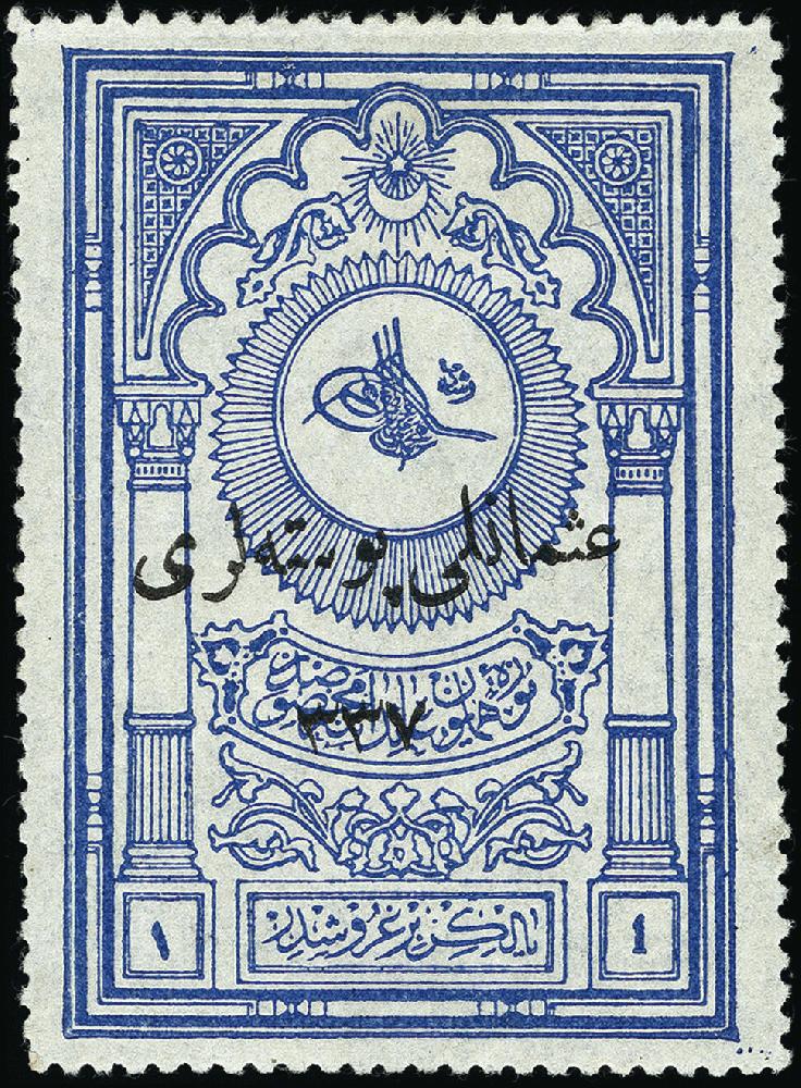 | Zusatzinformationen und Suchstichworte: | Heinrich Köhler 379. Auktion 19. - 24. September 2022 Los 1414 Türkei 1920, Ottoman Museum Revenue Stamp 1 pia. ultramarine with overprint error „1 of 1337 missing“ (plate IV, field 9), unsued, fine, very rare, only 29 stamps are printed with this overprint error, private signature and pencil signature and certificate Englert (1996) Ausruf 600,00 EUR |