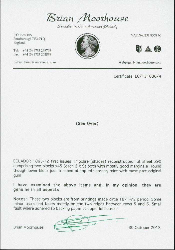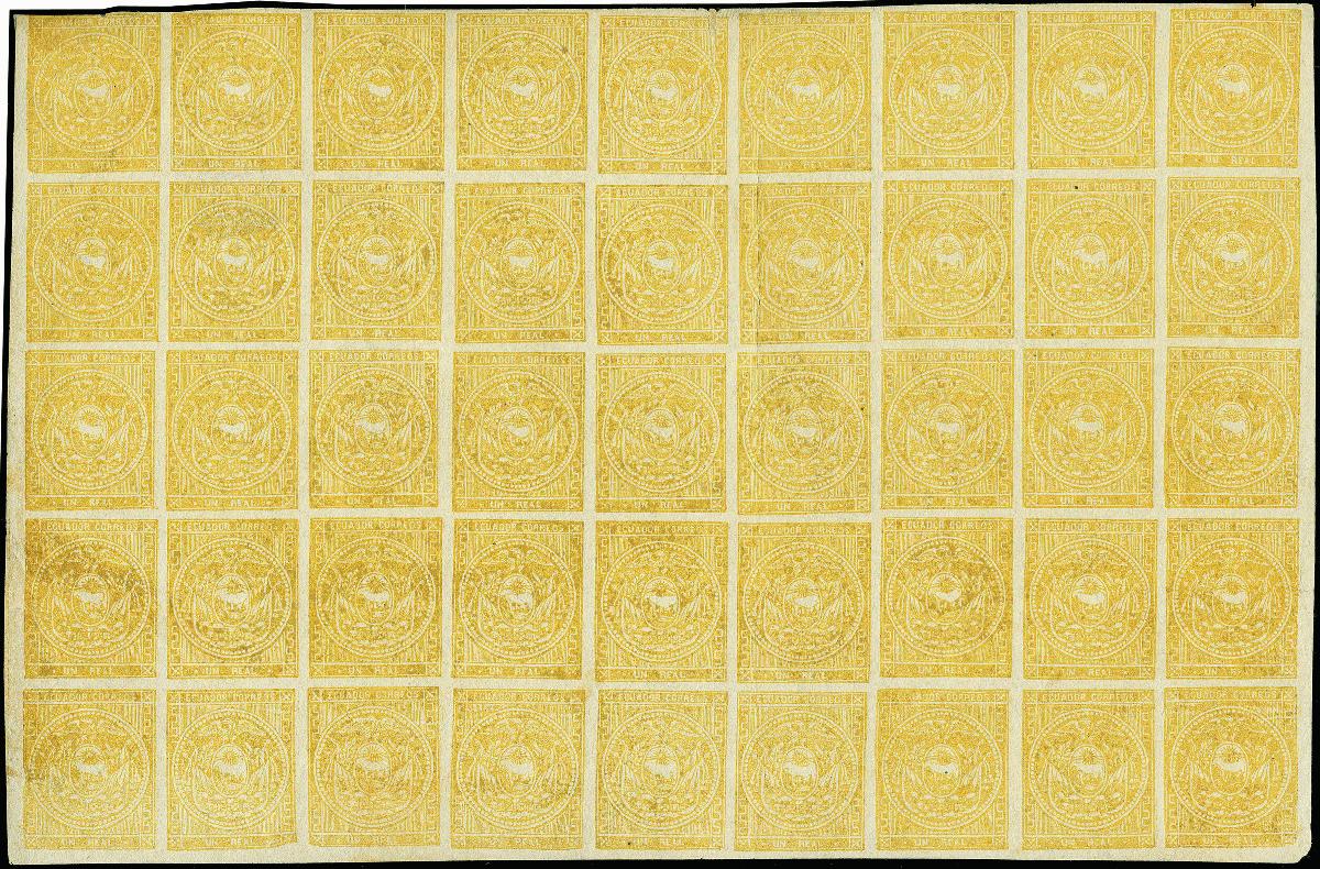 | Zusatzinformationen und Suchstichworte: | Heinrich Köhler 379. Auktion 19. - 24. September 2022 Los 1606 Ecuador 1869/73, 1 r. yellow-ochre, printing on porous paper, lower half sheet of 45 stamps , unused with original gum, two vertical creases (one with small paper break) and one horizontal bend Zuschlag 270,00 EUR |