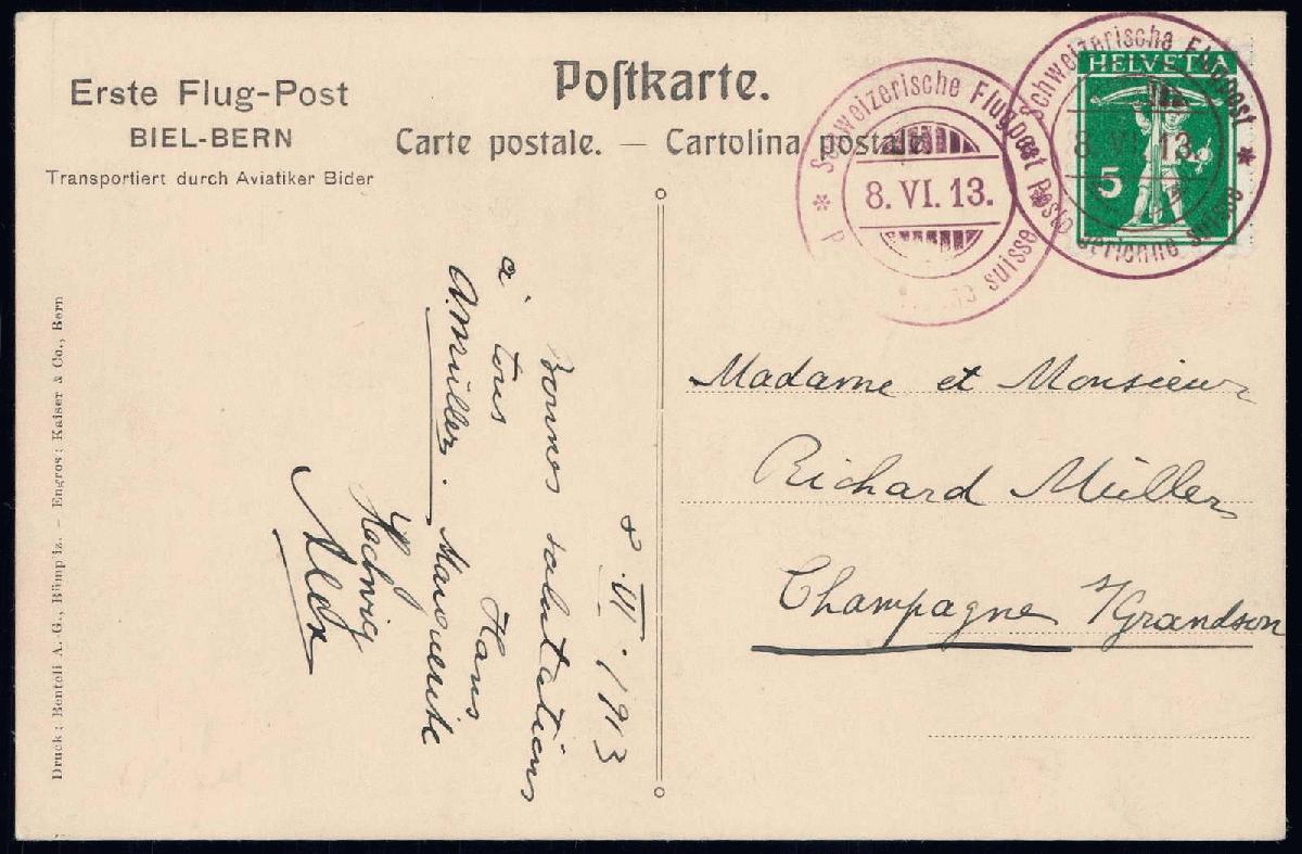 | Zusatzinformationen und Suchstichworte: | 6. Pilatusmail-Auktion 22. - 24. September 2022 Los 986 Schweiz Flugpostmarken 1913, Flugtag Biel, OK mit Zudruck Erste Flugpost mit rötlichlila SSt, ohne KSt, Befund Bohler, SLH 550.- Zuschlag 100,00 CHF |