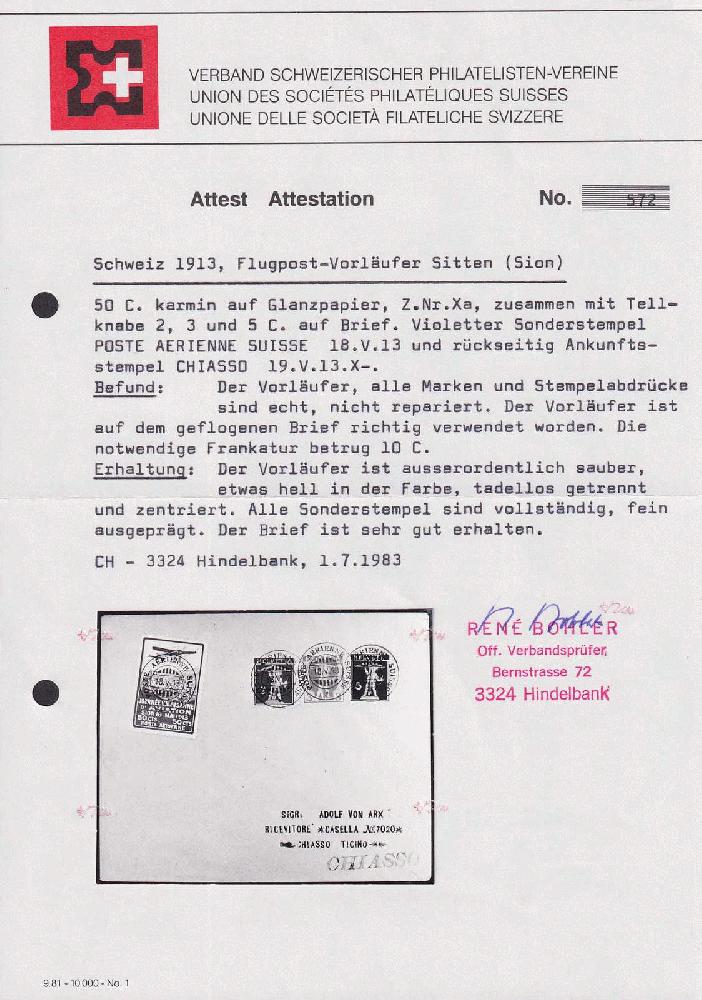 | Zusatzinformationen und Suchstichworte: | Luzernerraute Webshop Los 0000104550 Schweiz Flugpostmarken SION, Xa Vorläufer mit perfektem Zentrumsstempel & Tellen frankiert (Nr.102+123III+125III Rollenmarke) vom 18.V.1913 (violett) nach Chiasso, tadellos sauberer Beleg vor allem bez. Stempelsauberkeit und Zentrierung, SBK= (3'000.-) LP! mit Attest Bohler (83) rückseitig mit Ankunftsstempel. Einer der schönsten Beleg mit SION-Vorläufer, mit Provenienz IKARUS. Festpreis 2.800,00 CHF |